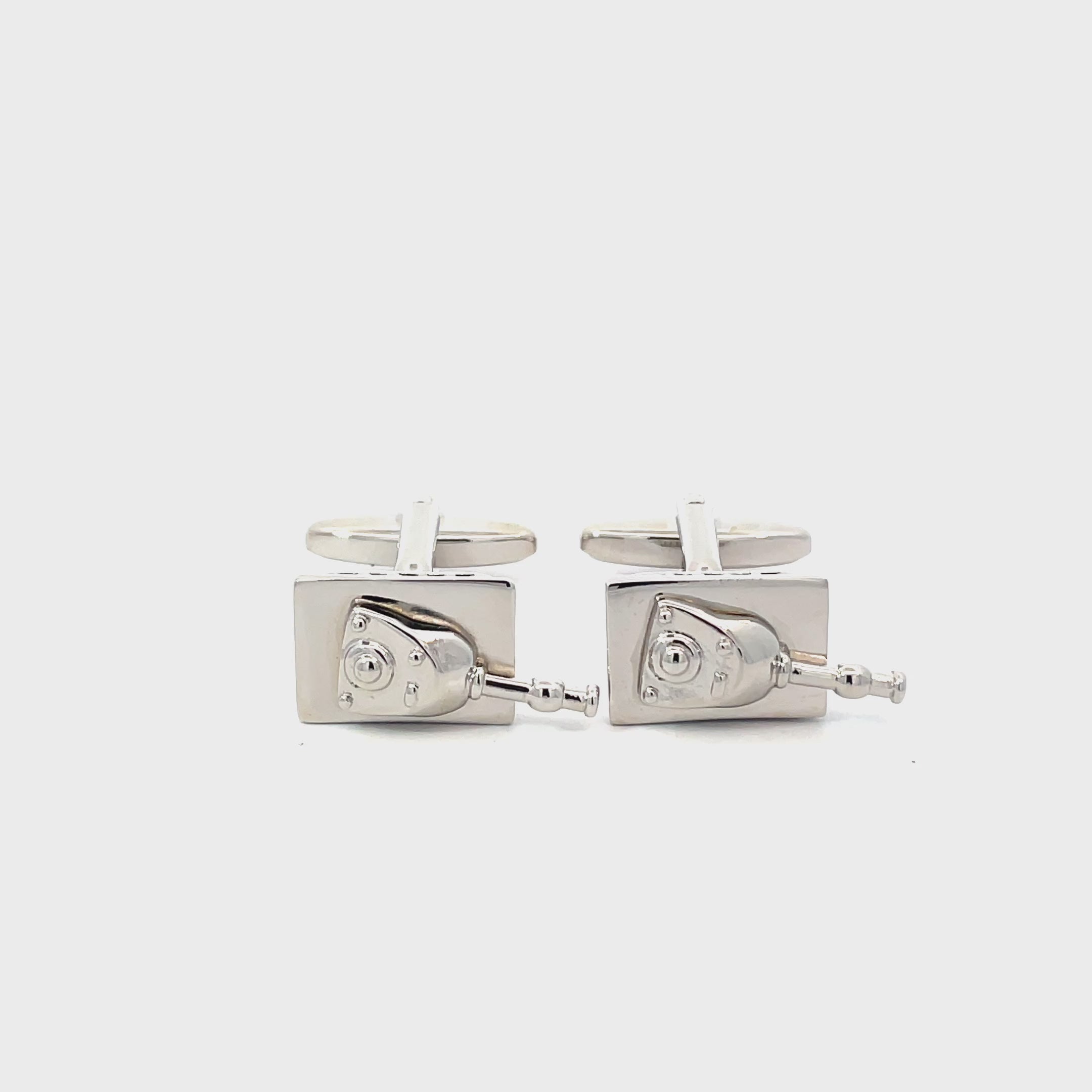 Make a statement of strength and strategy with these Battle Tanks Cufflinks. They feature detailed miniature tank designs that capture the power and precision of armoured engineering. Perfect for military enthusiasts, history buffs, or anyone ready to roll into formal occasions with commanding style. Finished in shiny rhodium plating.