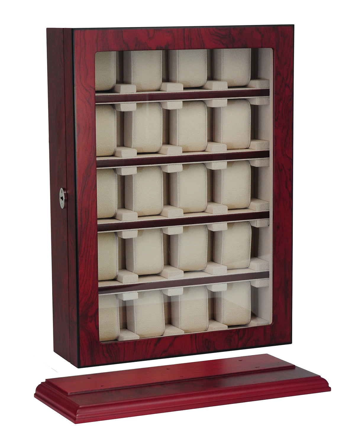 Quick same-day dispatchIntroducing the new addition to our watch cabinet range perfect for up to 20 watches. This watch cabinet for 20 is made of quality timber and gloss brass hardware. Clear glass shatter-proof lid to keep your watches dust-free