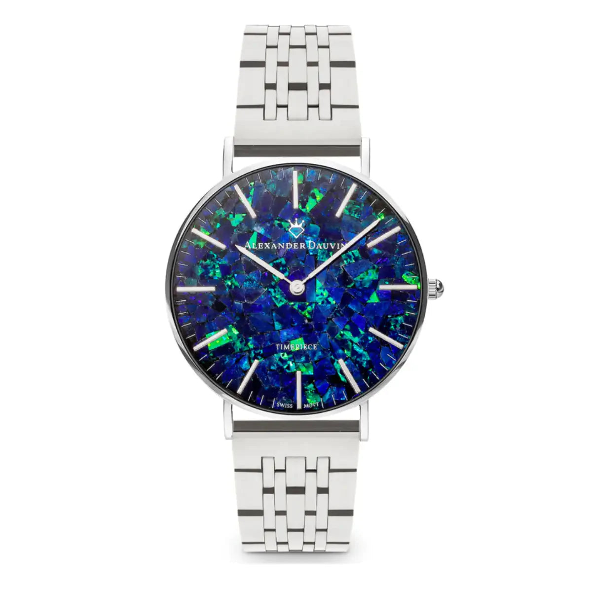 With its magnificent spectrum of colour, the Classic Ridge Blue Swiss Opal Watch is definitely an enchanting timepiece. The 36mm face, cased in silver colour features a mesmerising mosaic of opals with a classic silver stick index. The Silver Jubilee Strap perfectly complements this elegant style.