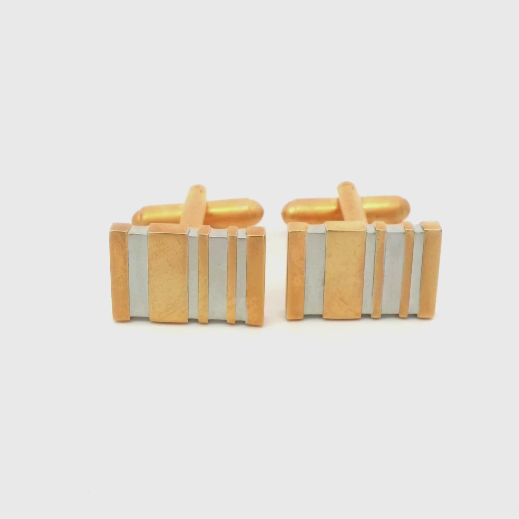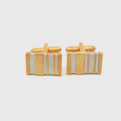 Introducing our Five Bar Matt Gold Cufflinks, these cufflinks feature a rectangular design with alternating gold and silver-toned horizontal stripes. The gold sections have a warm, lustrous finish, while the silver sections provide a contrasting cool tone.
