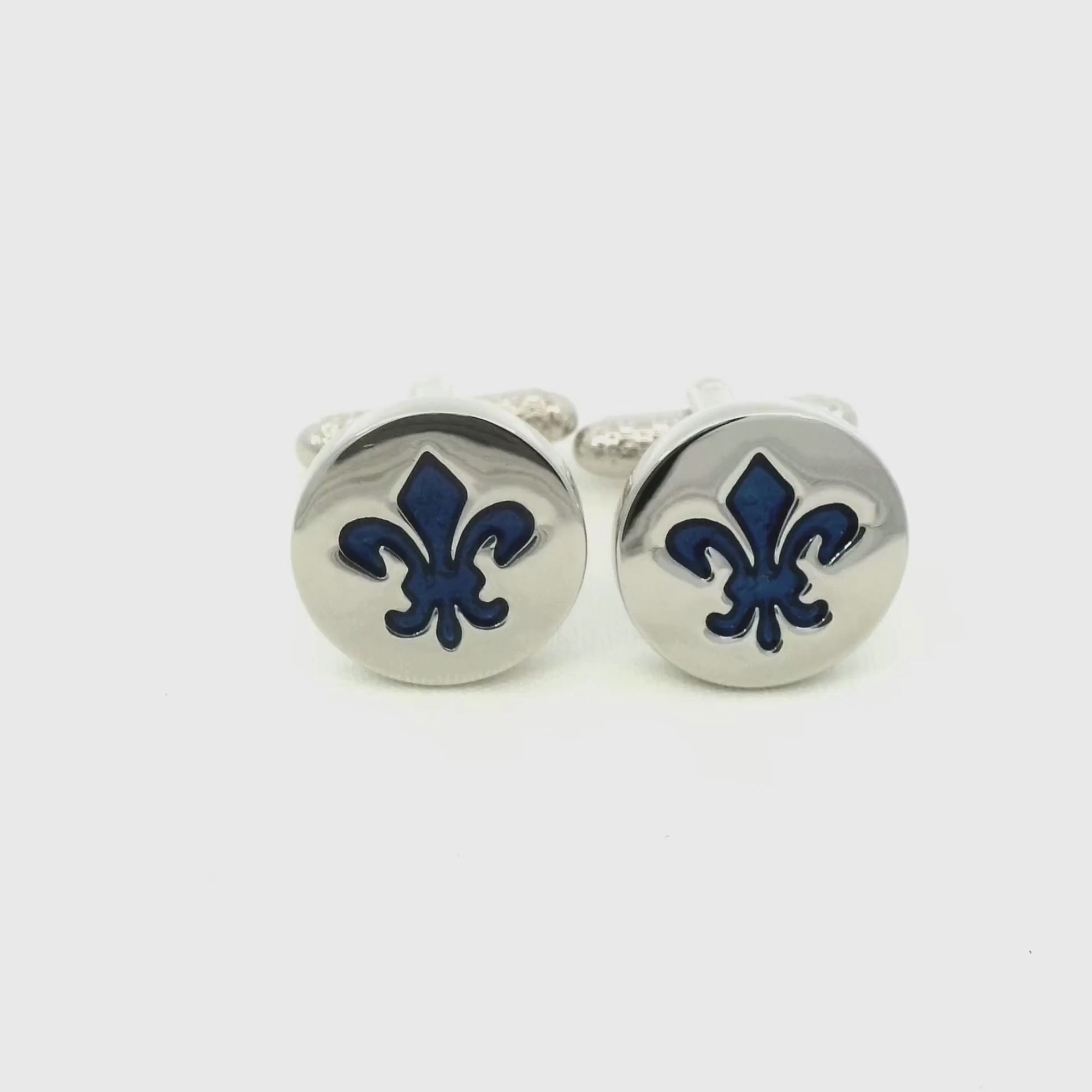 Fleur-de-lis Cufflinks - a symbol in heraldry and history. Give your wardrobe a touch of French flair by accessorizing with this pair of Fleur De Lis Blue cufflinks. These cufflinks are finished in a silver and blue coating that boast impeccable embellishments. Each pair is meticulously crafted by hand for a personal touch and to ensure quality and durability.