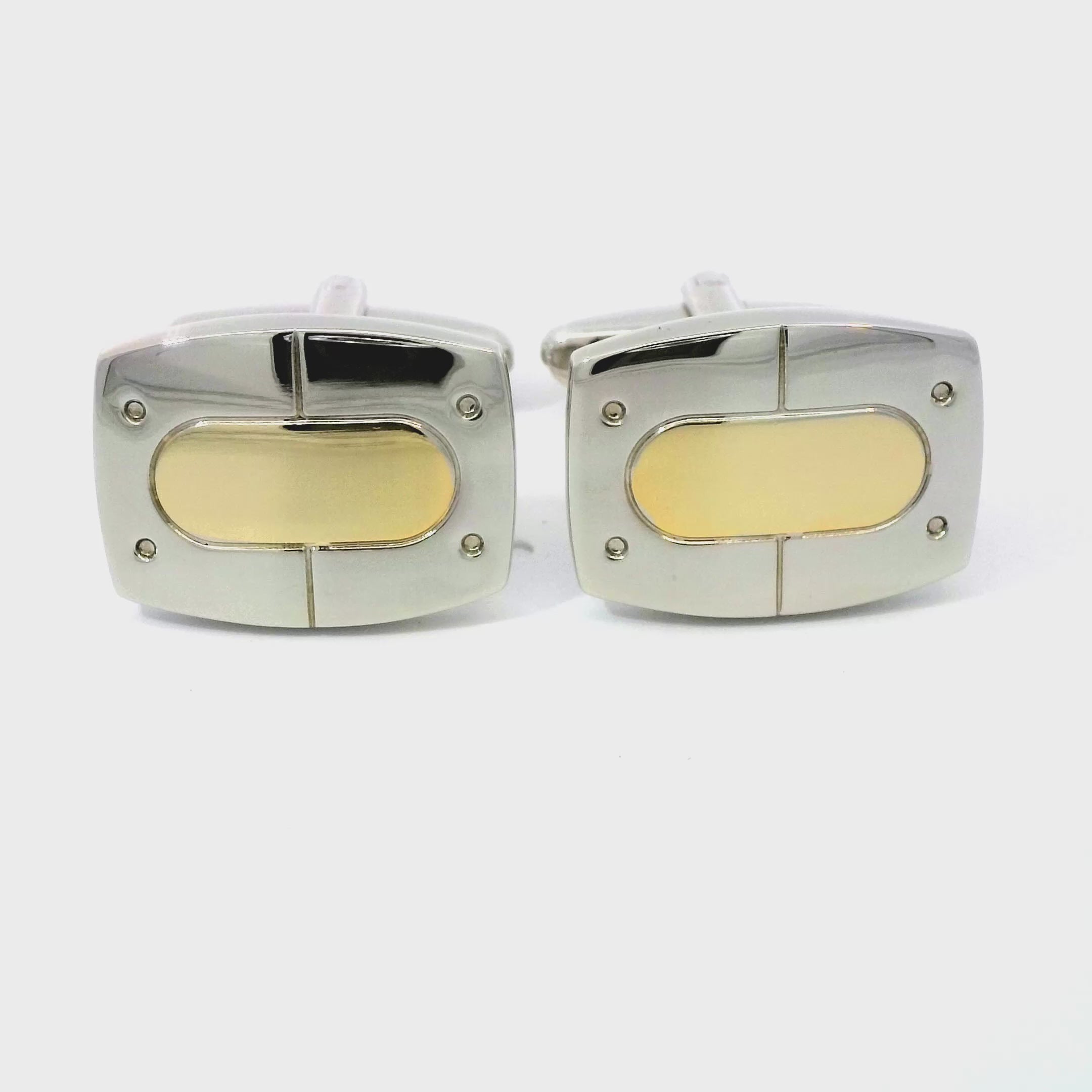 These elegant cufflinks feature a unique buckle design in gleaming gold and silver. Plated silver cufflinks featuring a gold-coloured centre. The patterning looks like a joined belt buckle with fake rivets in the four corners and a 'join' line down the middle. Perfect for any occasion, they effortlessly elevate your look with a touch of class.