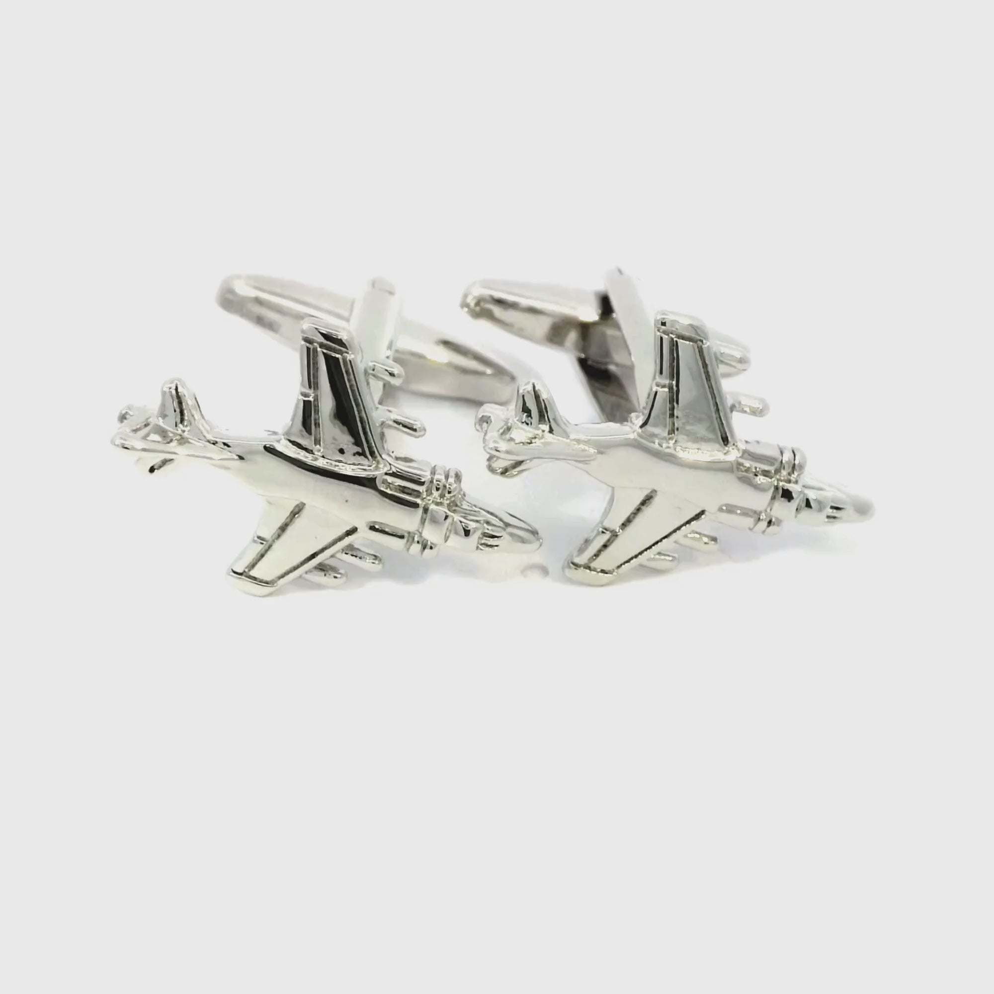 Take your style to new heights with these Harrier Jump Jet Cufflinks. Featuring a detailed design of the iconic aircraft, these cufflinks are perfect for aviation enthusiasts and anyone looking to add a bold, adventurous touch to their outfit. Finished in shiny rhodium plating.