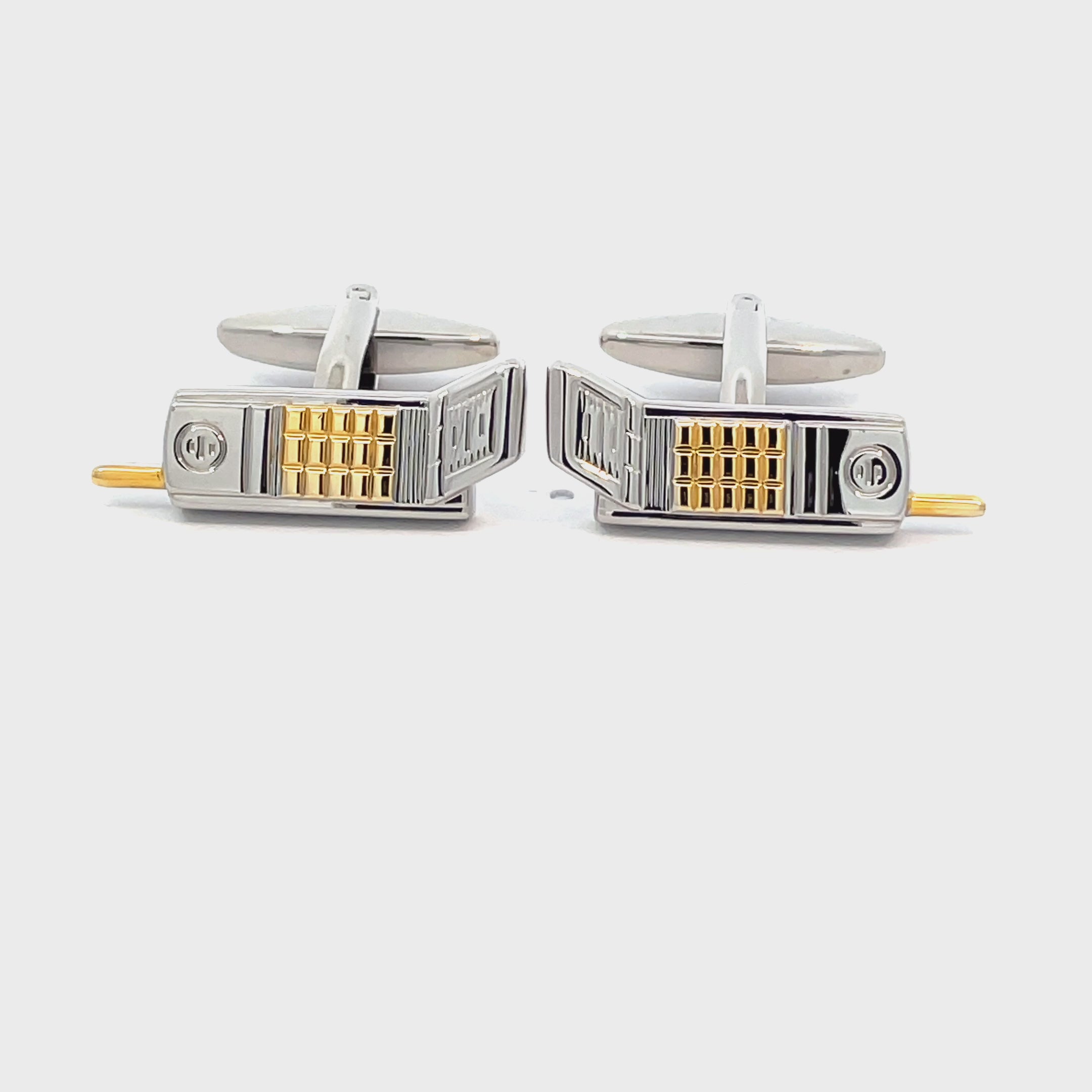 Make a bold statement with these Mobile Phone Cufflinks, a tribute to the iconic brick phones of the past. Expertly crafted in silver-tone metal with gold detailing, these cufflinks capture the nostalgic charm of classic mobile devices, complete with intricate keypad and antenna details. Finished in shiny rhodium plating.