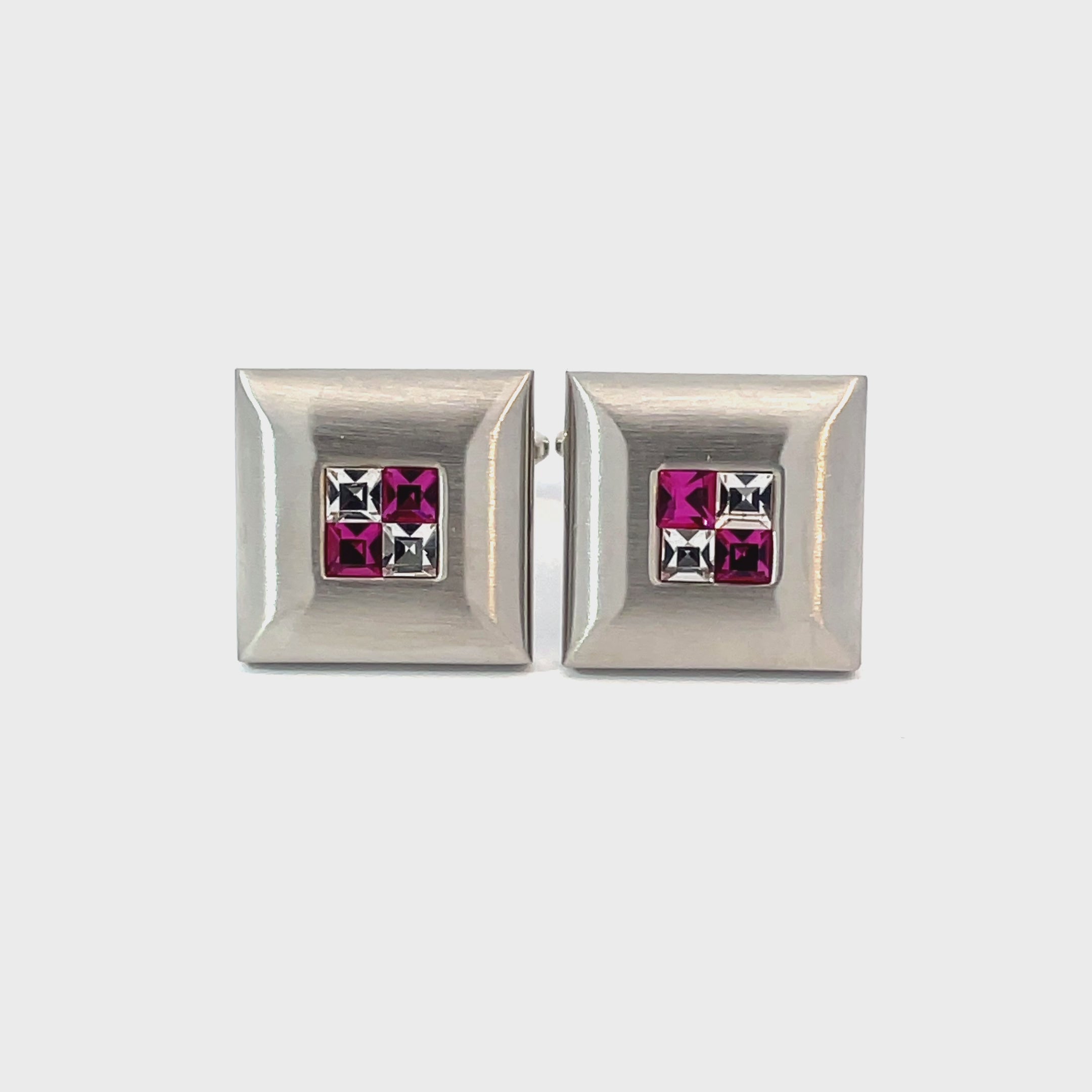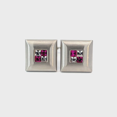 Make a subtle statement with these Purple Crystal Four Square Cufflinks. Set in a brushed silver-tone frame, each cufflink features four precision-cut crystals—two in deep purple and two in clear—for a balanced, elegant look. Finished in shiny rhodium plating.