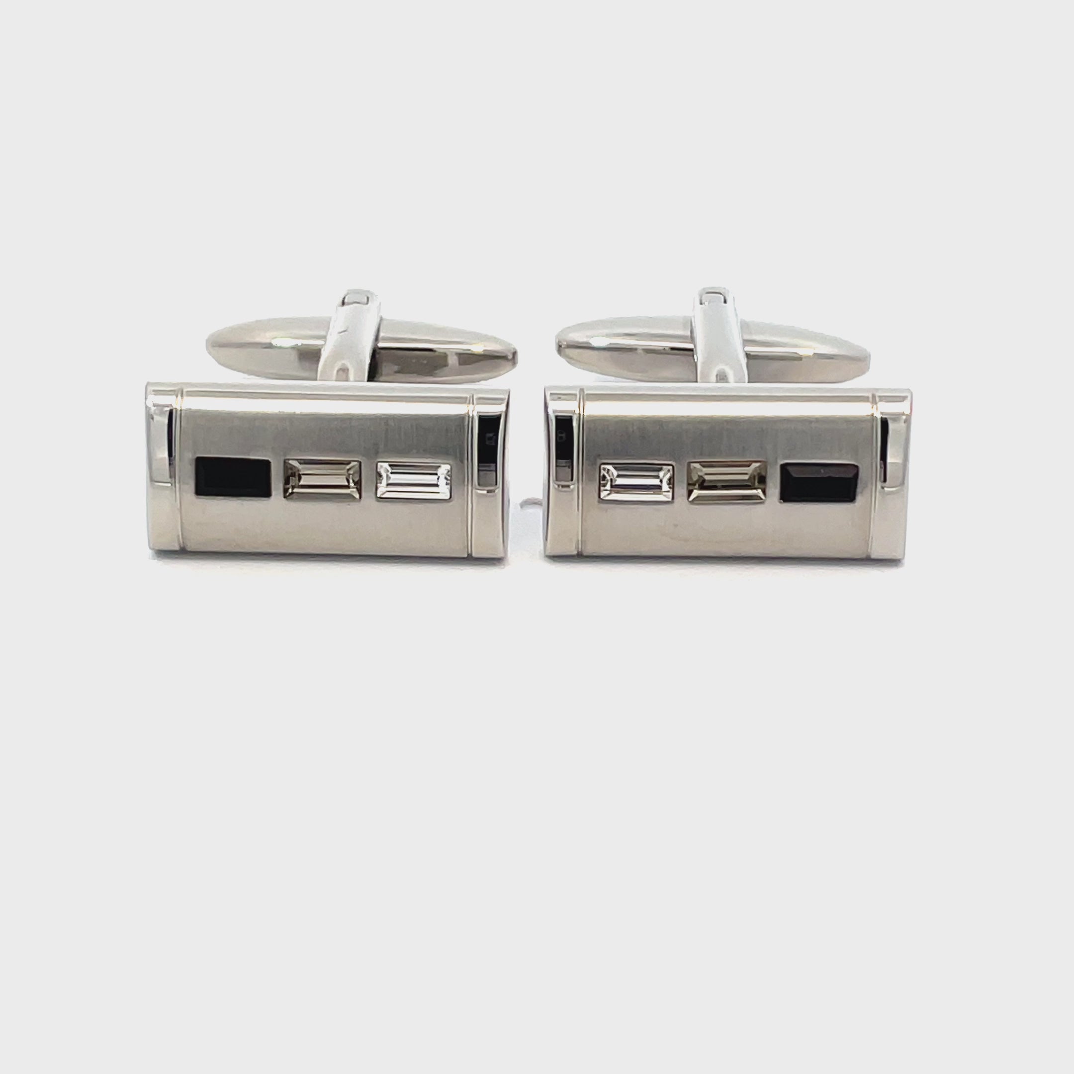 Sleek and sophisticated, these Rectangle Gallery Cufflinks feature a brushed silver-tone finish accented with a trio of rectangular-cut inlays in black and clear tones. The clean lines and minimalist elegance make them a versatile choice for formal occasions, business attire, or stylish evenings out. Finished in shiny rhodium plating.