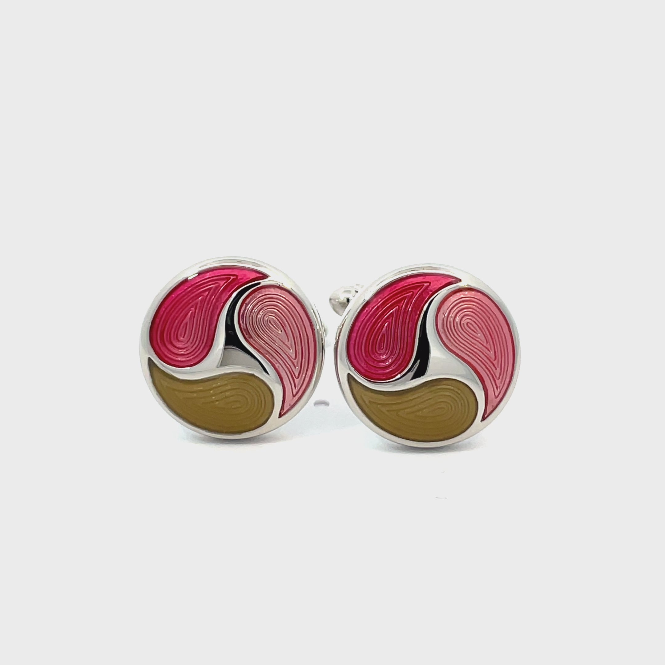 These Swirling Drops Pink Cufflinks feature a bold circular design with glossy enamel in pink and gold tones, finished with a sleek silver border. A standout pair that adds colour and personality to any formal look. Finished in enamel and shiny rhodium plating.